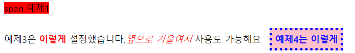 <span style ="display:inline-block; margin:10px; padding:5px; border:dotted 5px blue; color:blue; font-weight:bold; background:pink;">예제4는 이렇게</span> <br>